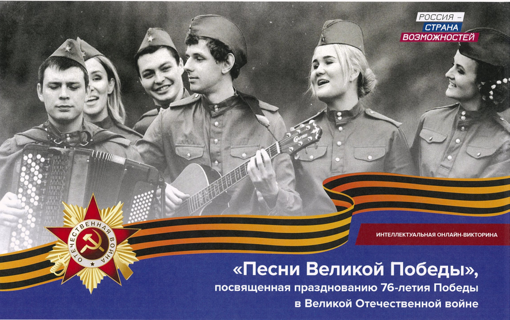 В честь 76-летия Дня Великой Победы, Президентская платформа «Россия — страна возможностей» объявляет регистрацию на Всероссийскую онлайн-викторину «Песни великой Победы», посвящённую событиям Великой Отечественной войны и музыкальным композициям военных лет.
