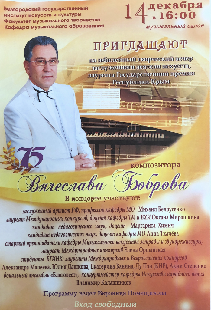 14 декабря в 16:00 в музыкальном салоне Белгородского государственного института искусств и культуры состоится юбилейный творческий вечер заслуженного деятеля искусств, лауреата Государственной премии Республики Крым, композитора Вячеслава Боброва.