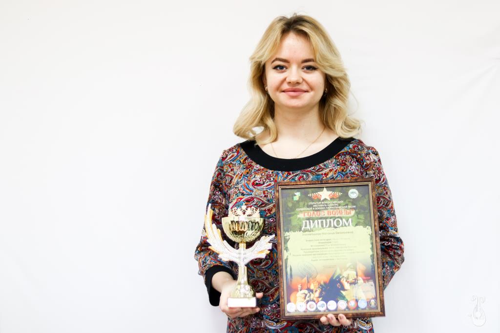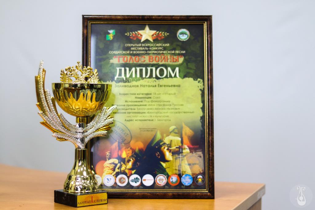 Студентка кафедры музыкального образования Белгородского государственного института искусств и культуры Наталья Заливадная стала лауреатом I степени в четвёртом открытом Всероссийском фестивале солдатской и военно-патриотической песни «Голос войны».