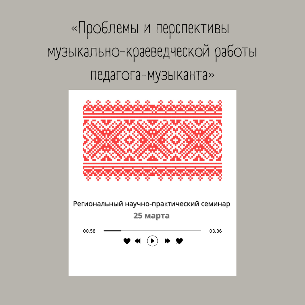Кафедра музыкального образования факультета музыкального творчества Белгородского государственного института искусств и культуры, в рамках Года сохранения культурного наследия народов России, приглашает всех желающих к участию в Региональном научно-практическом семинаре «Проблемы и перспективы музыкально-краеведческой работы педагога-музыканта». Научно-практический семинар пройдёт 25 марта на базе творческого вуза в аудитории 217.