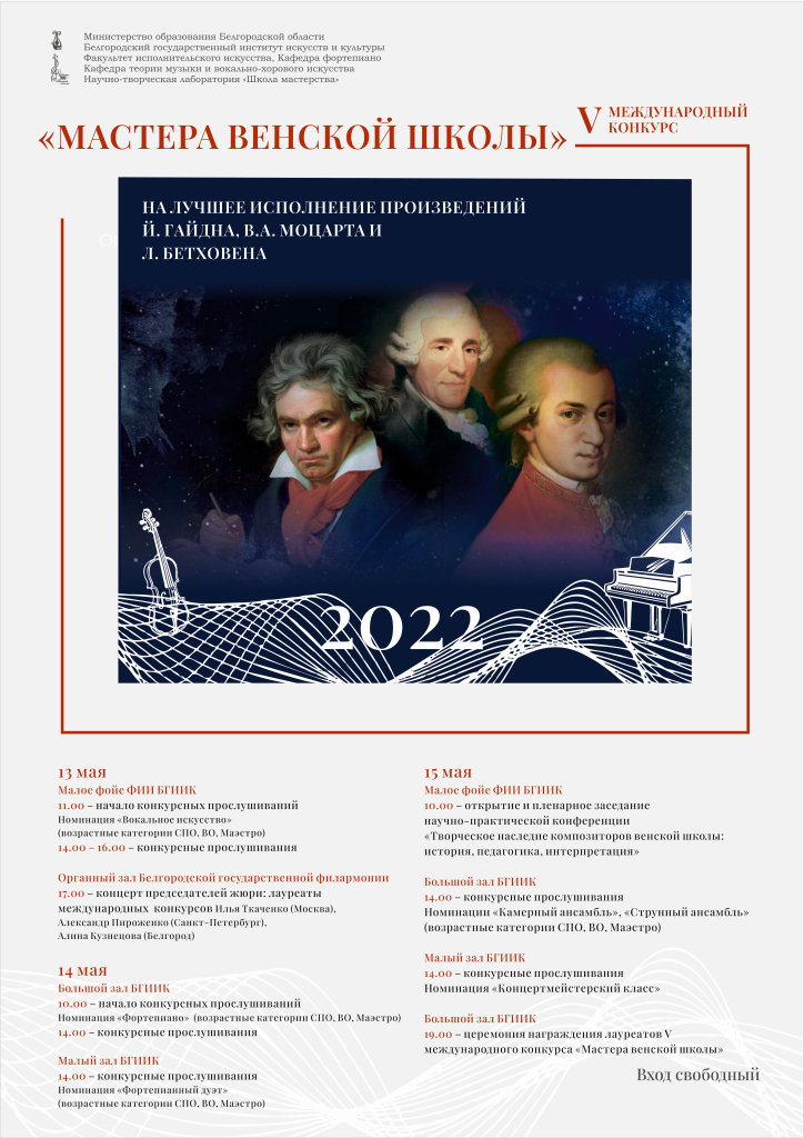 В Белгородском государственном институте искусств и культуры проходит V Международный конкурс «Мастера венской школы». Впереди ещё три дня, посвящённых великим произведениям классиков: Йозефа Гайдна, Вольфганга Амадея Моцарта, Людвига ван Бетховена.