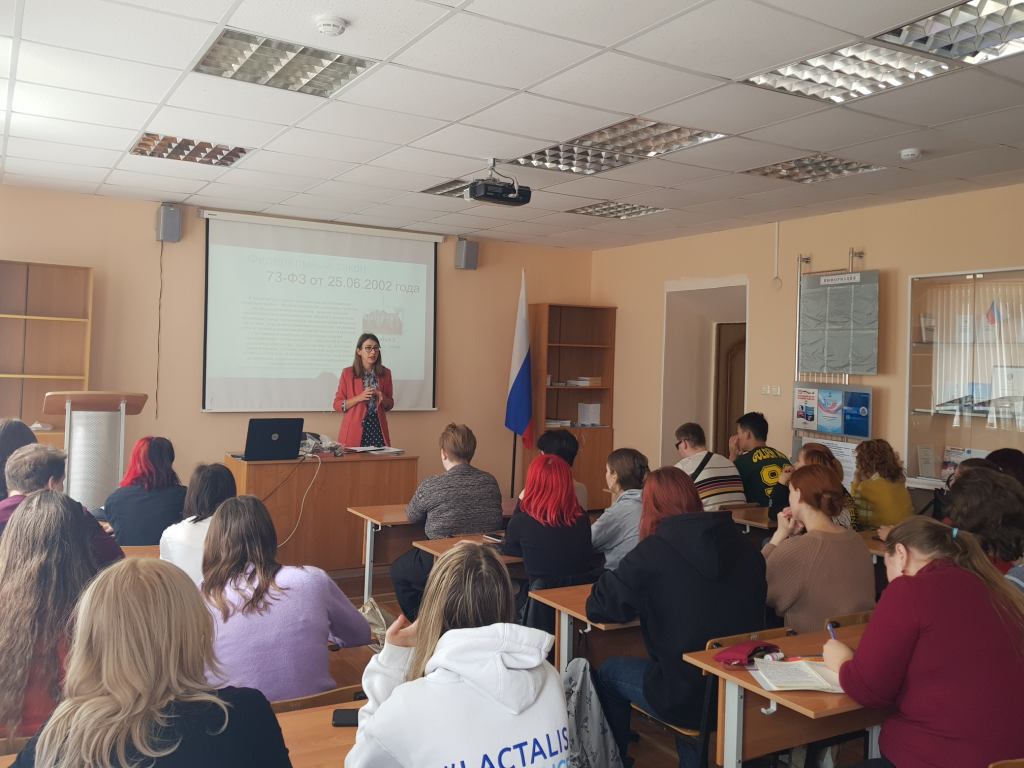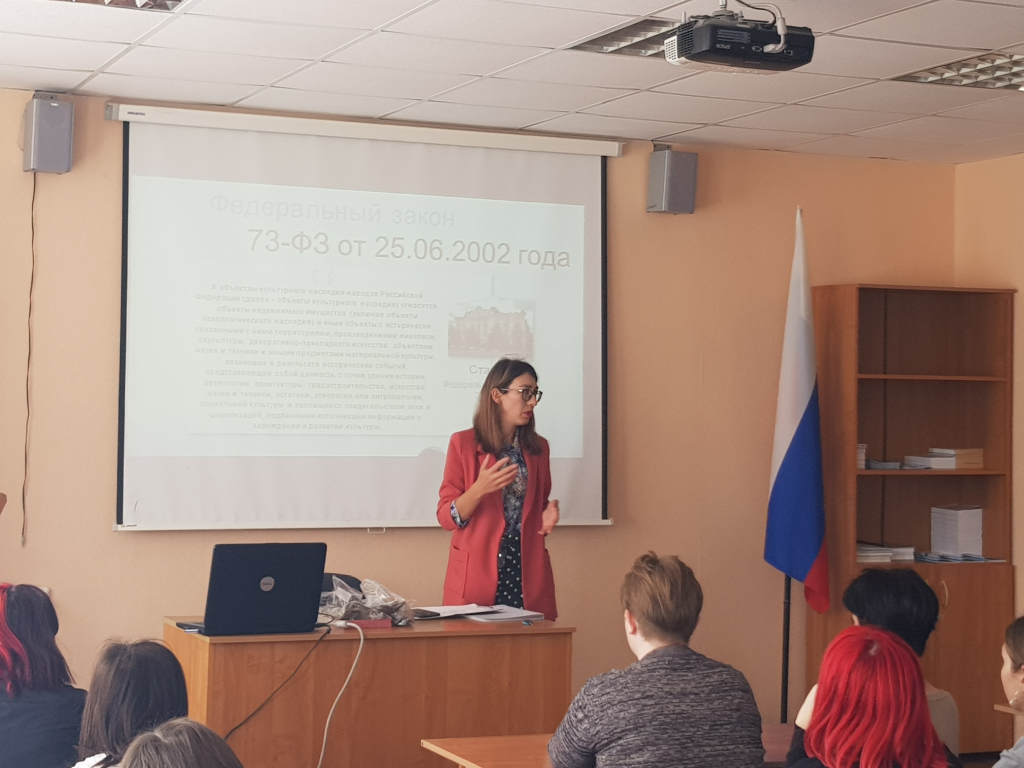 В ходе беседы Анастасия Андреевна рассказала студентам о законодательстве в сфере охраны объектов культурного наследия, были рассмотрены примеры объектов культурного наследия, находящихся на территории региона, проанализированы результаты исследований объектов археологии Белгородской области.