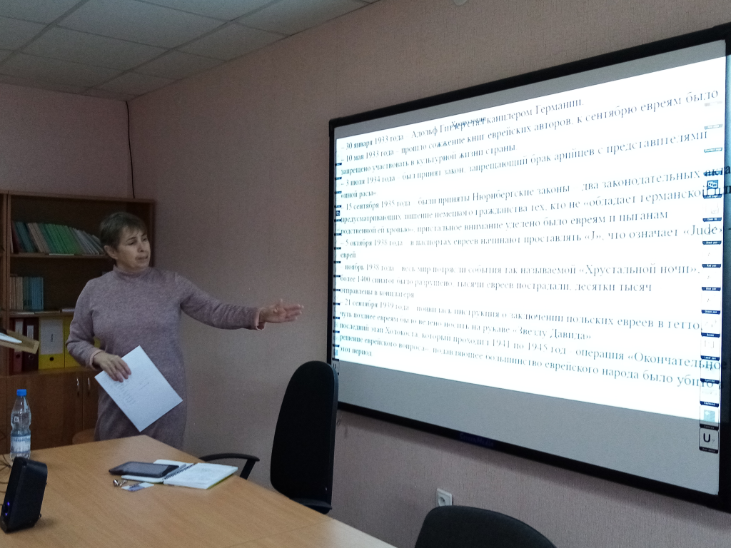 Преподаватели вуза, в том числе доцент кафедры философии, культурологии, науковедения Марина Кулабухова, доцент, заведующий кафедрой общетеоретических и гуманитарных дисциплин Сергей Зенин, педагог кафедры общетеоретических и гуманитарных дисциплин Валентина Климова рассказали студентам о трагической истории Холокоста. Участники мастер-класса познакомились с документами, подтверждающими чудовищные преступления нацистов, с произведениями художественной литературы, киноискусства XX-XXI веков, посвящёнными трагедии.