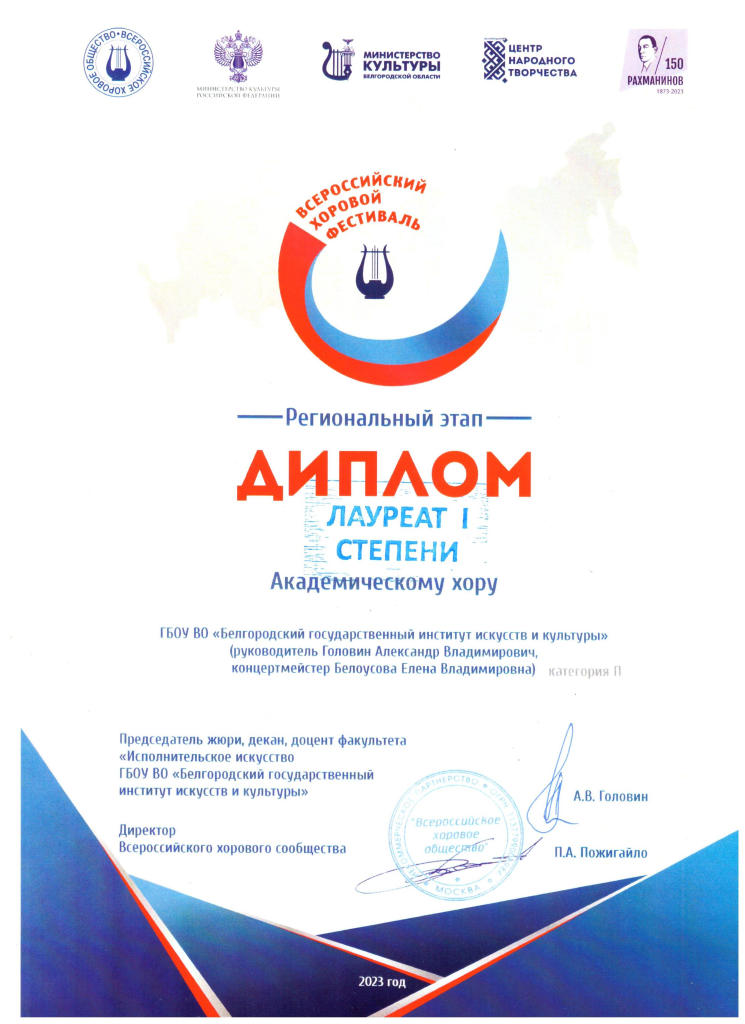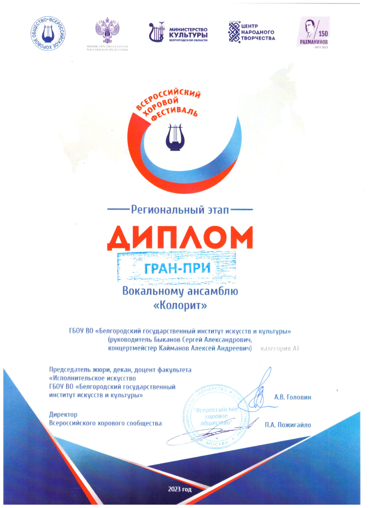 Белгородский государственный институт искусств и культуры принял участие в региональном этапе Всероссийского хорового фестиваля-конкурса, посвящённого музыкальному наследию Сергея Рахманинова. Творческие коллективы заслуженно получили свои награды. Вокальный ансамбль «Колорит» удостоен Гран-при, академический хор БГИИК лауреат I премии.