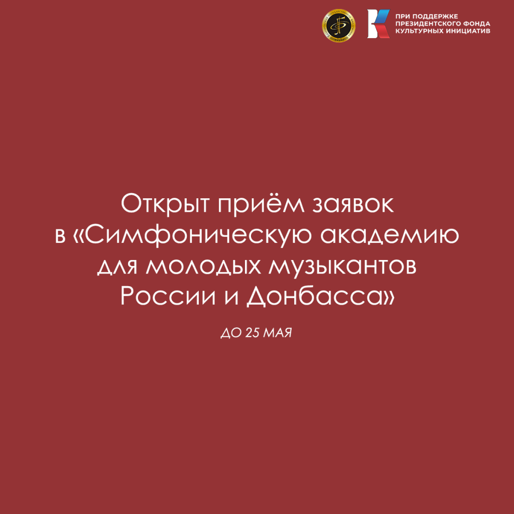 Открыт приём заявок для участия в творческом проекте «Симфоническая академия для молодых музыкантов России и Донбасса». Проект — победитель первого грантового конкурса 2023 года Президентского форда культурных инициатив.