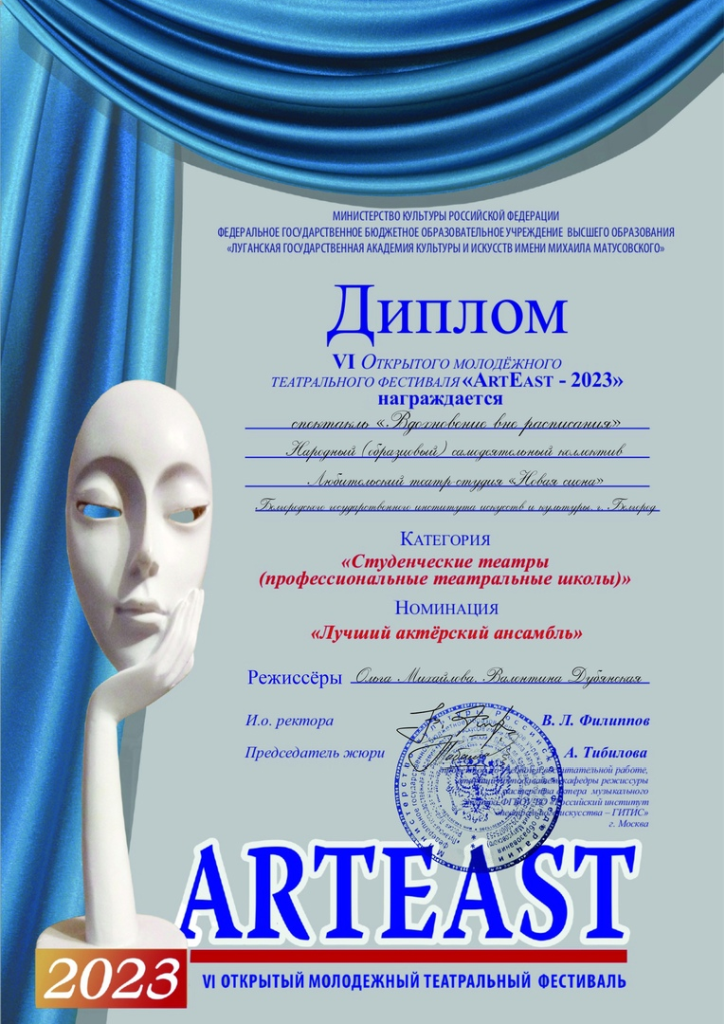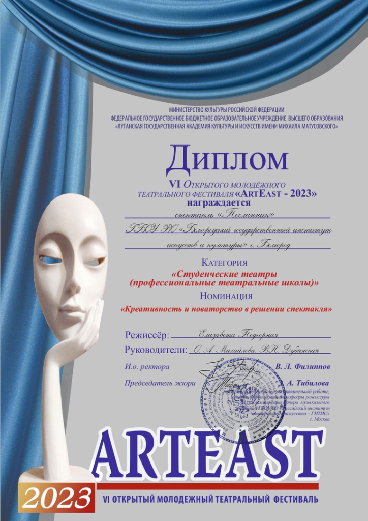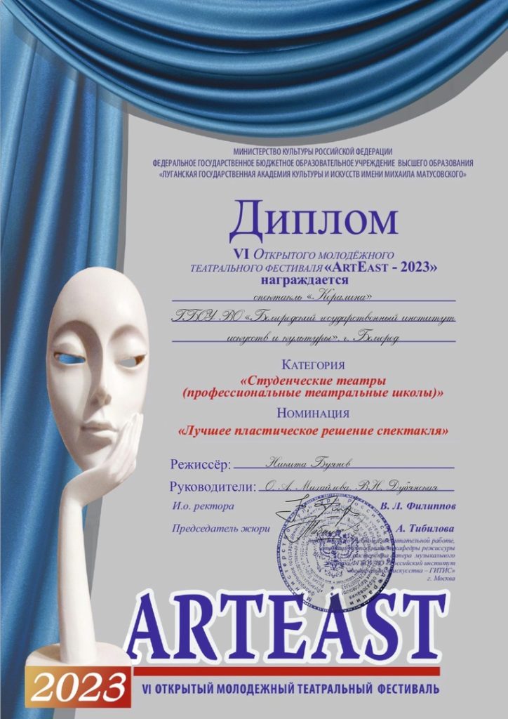 VI Открытый молодёжный театральный фестиваль ArtEast завершился в Луганской государственной академии культуры и искусств имени Михаила Матусовского. Студенты кафедры актёрского искусства Белгородского института искусств и культуры и театр-студия «Новая сцена» приняли в нём участие.