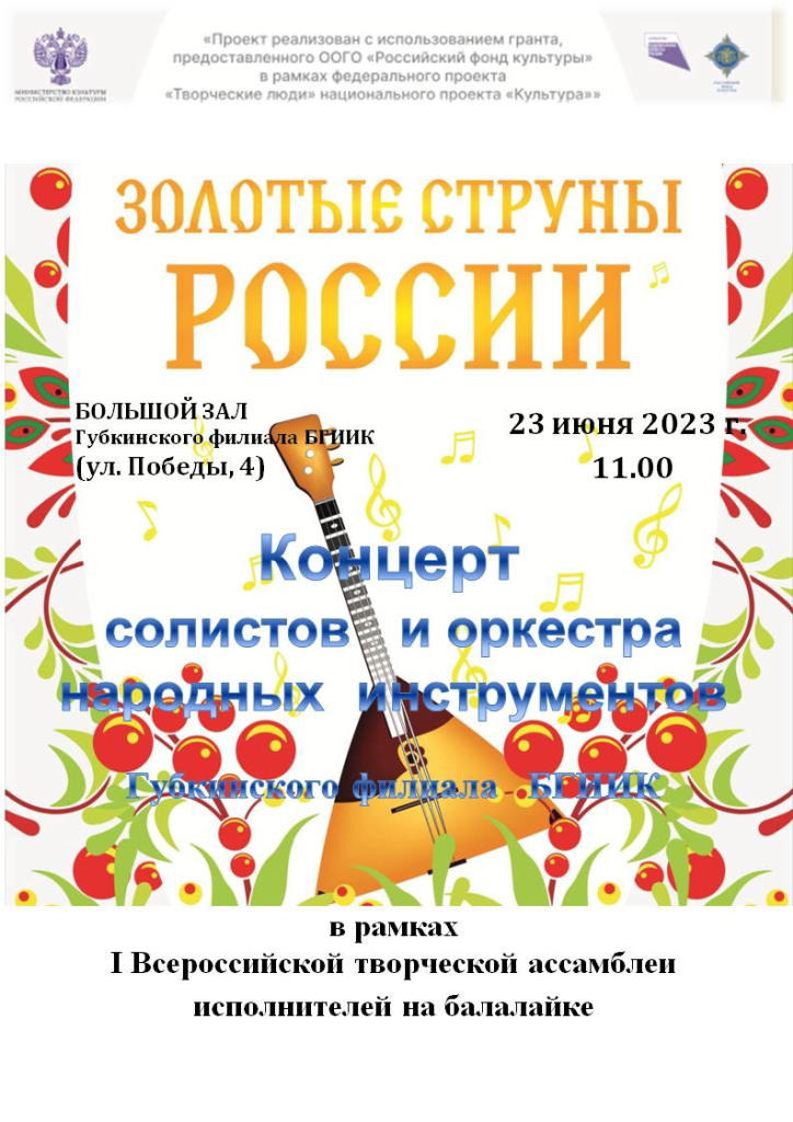 В Большом зале Губкинского филиала Белгородского государственного института искусств и культуры состоялось открытие проекта «I Всероссийская творческая Ассамблея исполнителей на балалайке "Золотые струны"». Концерт оркестра русских народных инструментов прошёл под руководством главного дирижёра и преподавателя отделения оркестровых инструментов филиала Николая Полосаева.