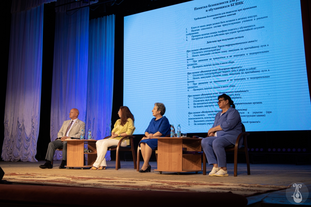 Особое внимание уделили вопросам безопасности. Александр Неверов — начальник службы безопасности — рассказал о правилах поведения при чрезвычайных ситуациях, прокомментировал памятку безопасности БГИИК.