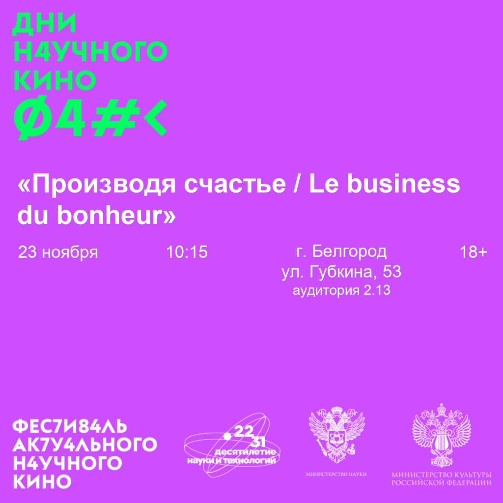Первый показ «Производя счастье / Le business du bonheur» — 23 ноября в 10:15 на факультет дизайна и технологий в аудитории 2.13. Вход для студентов и всех желающих старше 18 лет бесплатный.
