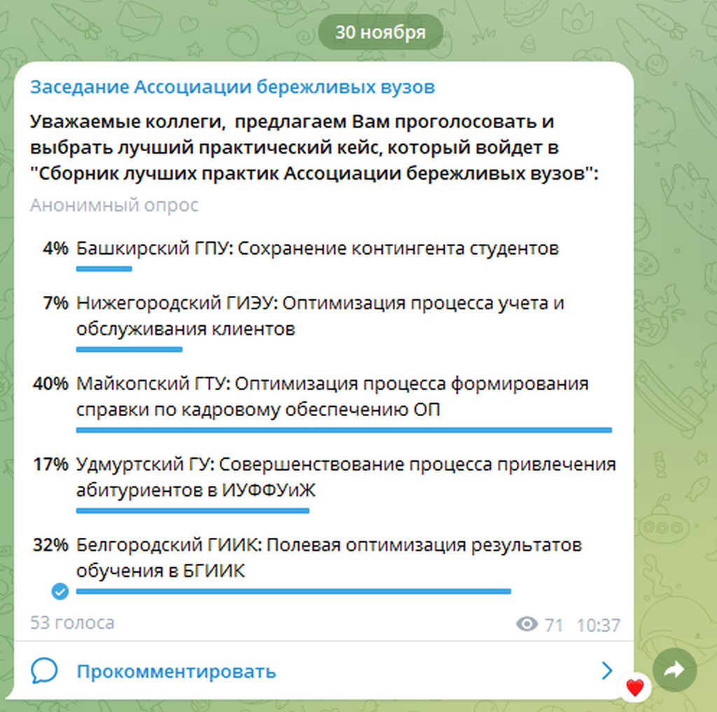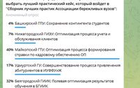 По результатам презентации и экспертных оценок, был выбран лучший практический кейс для дальнейшего тиражирования. Им стал проект Майкопского государственного технологического университета «Оптимизация процесса формирования справки по кадровому обеспечению образовательной программы». По результатам голосования, проект БГИИК был высоко оценён и занял почётное второе место, незначительно уступив победителю.