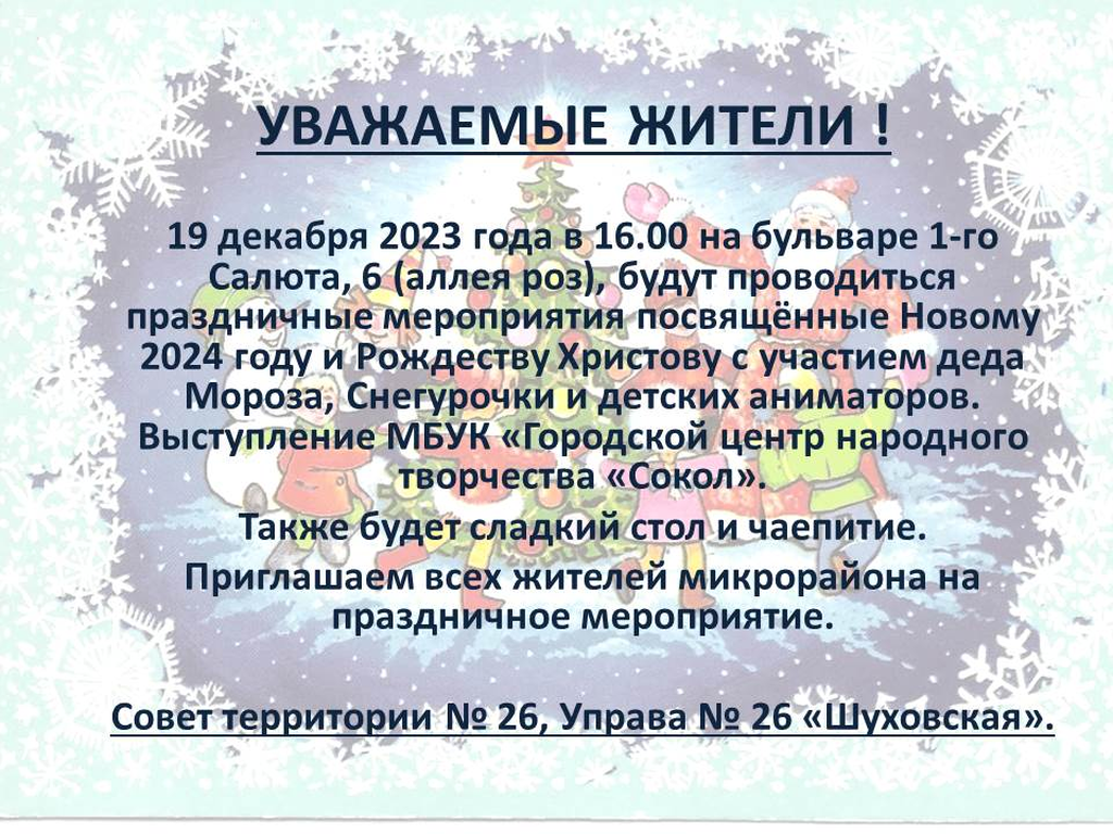 Белгородцев поздравят главные символы Нового года: Дед Мороз и Снегурочка. Присоединятся к поздравлению коллективы Центра народного творчества «Сокол» и аниматоры. А согреет гостей горячий чай и сладкий стол.