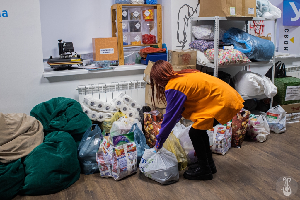 Принимали гуманитарную помощь в «Добро.Центре» вуза. Неравнодушные люди приносили продукты длительного хранения: мясные, рыбные, фруктовые и овощные консервы, энергетические либо протеиновые батончики, консервированные каши, супы и каши быстрого приготовления. Из сладостей — порционный шоколад, сухофрукты, орехи, конфеты и печенье, сгущенное молоко. Складывали в посылку хлеб и сухари, рафинад, соль и перец, воду и соки в упаковках до одного литра, порционный растворимый кофе и пакетированный чай. Необходимость на фронте есть и в гигиенических товарах: пена для бритья и крем после него, одноразовые бритвенные станки, зубные щётки и пасты, мыло, шампунь для волос, дезодоранты и гели для душа. Принимались мочалки для тела, влажные и бумажные салфетки, антисептики.