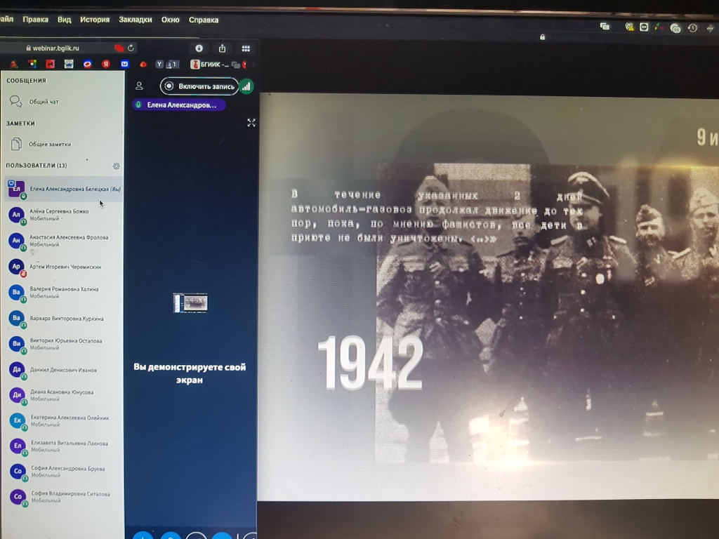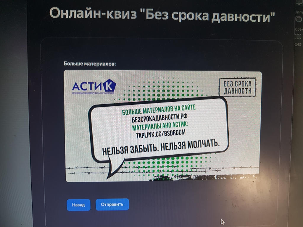 Сегодня на факультете социально-культурной и информационно-библиотечной деятельности проведены кураторские часы для студентов среднего профессионального и высшего образования. Основная цель — это сохранение памяти о подвигах наших героев. Обучающиеся приняли участие в онлайн-квизе «Без срока давности»