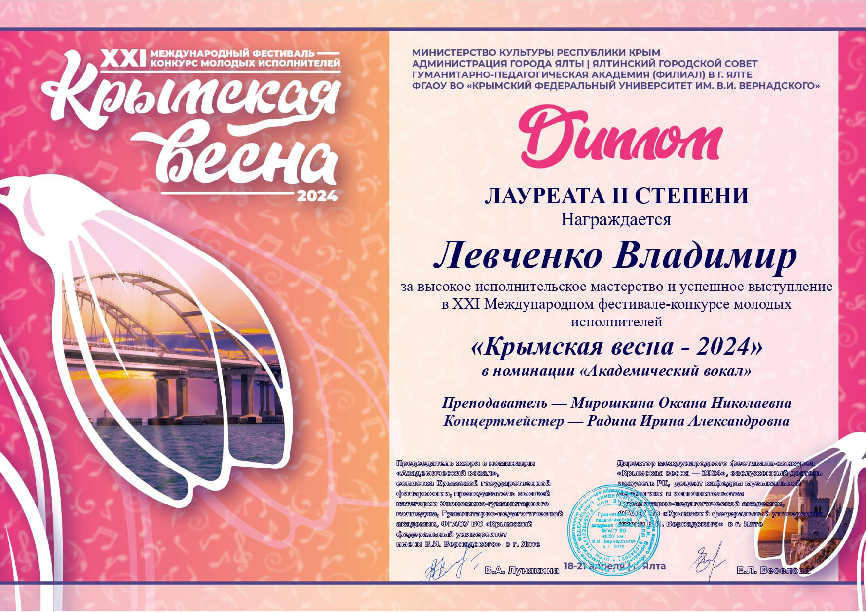 С 18 по 21 апреля в Ялте проходил XXI Международный фестиваль-конкурс молодых исполнителей «Крымская весна – 2024». Белгородский государственный институт искусств и культуры – участник конкурса.